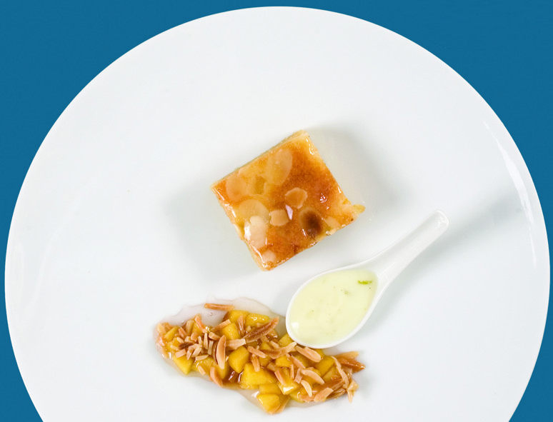 In a blender, mix the marzipan along with the eggs until smooth and then blend in the sifted flour, starch and baking powder. Finally, stir in the melted butter, the wine and anise liquor. Place the dough in a 20 cm/8 inch diameter removable bottom tart pan, previously lined with sliced almonds. Dice five apricots into cubes of about 5 cm/1.9 inch and sprinkle them on top. Bake at 190°C/374ºF for 18 to 20 minutes. Once cooked, remove from the tart pan carefully and allow to cool before coating with powdered sugar.