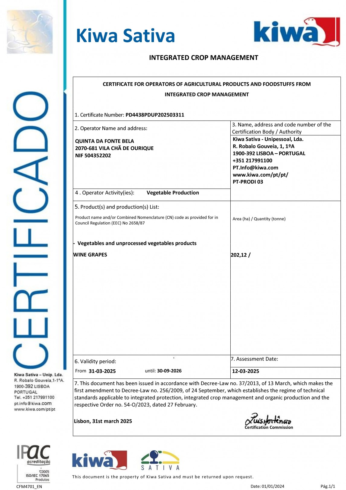 Kiwa Sativa, in a transparent and independent process, audited the sustainable management of the DFJ VINHOS organization, granting the right to use a seal, thus demonstrating our commitment to the sustainable production of quality wines.
